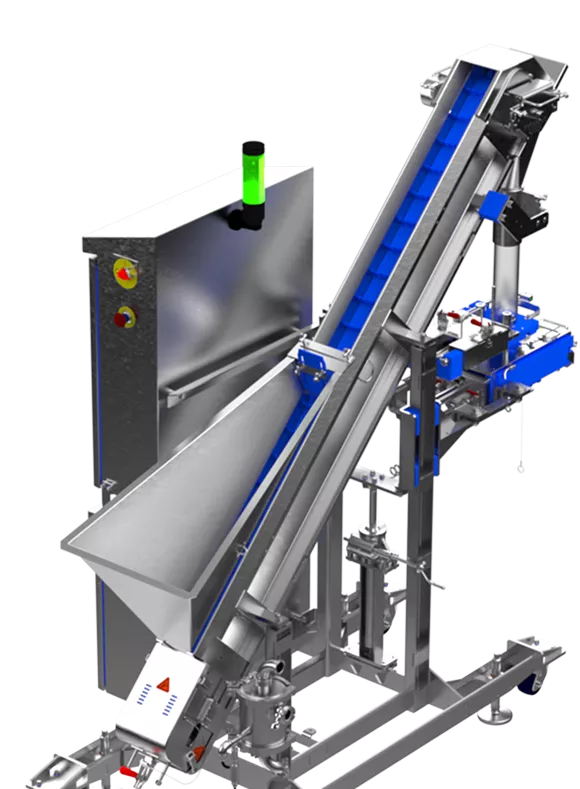 When the product is loaded into the hopper a conveyor belt with a special finger design, driven by a variable frequency drive, meters the product to the filling head.